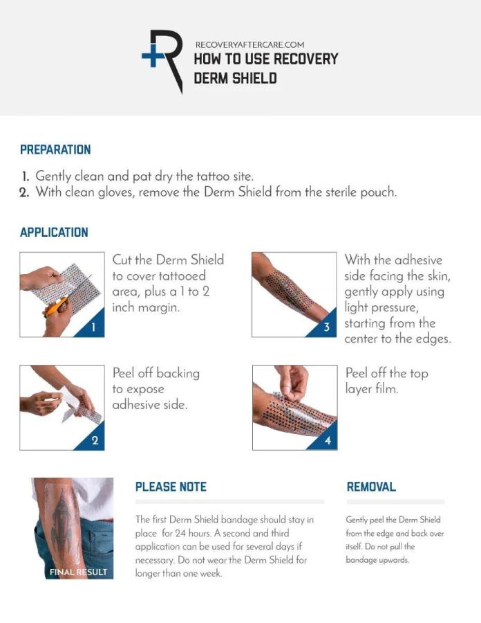 Gently clean and pat dry the tattoo and surrounding area, ensuring there is no soap or any residue on the skin. With clean gloves, remove Derm Shield from the sterile pouch. Cut the Derm Shield to cover tattooed area plus a 1 to 2 inch margin from the edge of the tattoo. Peel off backing to expose adhesive side and position the Derm Shield over the tattoo with the adhesive side facing the skin. Gently apply using light pressure, starting from the center to the edges to eliminate air bubbles. Do not stretch the Derm Shield during application.